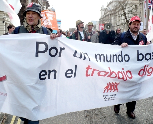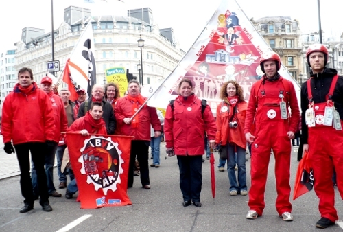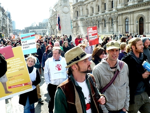 Onder de slogan 'Put People First!' betoogden vandaag een 35.000-tal mensen door de straten van Londen. Een bonte mix van Ngo's en vakbonden riepen de leiders van de G20 op om bij hun bijeenkomst volgende week niet enkel maatregelen te nemen om de bedrijven te redden maar ook werk te maken van een echt sociaal en groen herstellingsplan. De overheden moeten volgens de betogers dringend werk maken van echte maatregelen om de wereldwijde armoede, de opwarming van het klimaat en de stijgende werkloosheid aan te pakken. Van de buitenlandse delegaties waren vooral de vakbonden van de verschillende Europese landen vertegenwoordigd. België viel in de kijker met veruit de hoogste buitenlandse delegatie van 250 vakbondsmilitanten en een 40-tal NGO-leden en vrijwilligers waaronder 11.11.11 en Attac. Enkele sfeerfoto's.