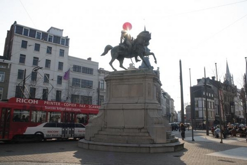 Een roze bol staat op de plek waar normaal het hoofd van koning Leopold I hoort te staan aan de Leopoldplaats in Antwerpen. Stunt of niet?