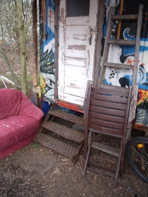“I like living like this. I found a way to live in a way that suits me. And I don't think that will change very soon. I don't need to work whole day and I can organise my life as I want. I don' t think about future either. The farest I look is two weeks ahead. But believe me, I'm not bored at all. There's enough work to do around this place. The garden needs to be done. The wood for the heating needs to be chopped and so on. So I' m always busy around here. The citycouncil managed to get us a 'contract' to use this percil. But I don' t like that arrangement. We were using this lap of land anyway, so I think there is no adventage for us really. In two years the contract finishes. No one knows what will happen after that. “