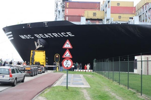 De MSC Beatrice,het grootste containerschip ter wereld,is dinsdagmiddag aangemeerd in de haven van Antwerpen.