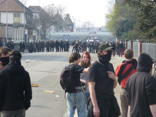 De achterkant van de betoging werd vakkundig afgesloten door twee goederenwagons (een spontane inval?!). Er werd duidelijk niets aan het toeval overgelaten. Duizenden betogers, waarvan een ook enkele honderden gemaskerde radicalen, als ratten gevangen tussen politie en politie. Een ongevraagde uitnodiging tot confrontatie zeg maar.