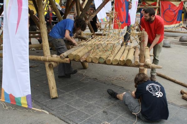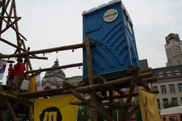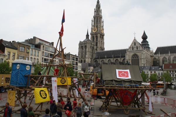 8 Chiro jongens van Chiro Sentroem kruipte donderdag middag op een platform,3 meter hoog boven de Groenplaats in Antwerpen.