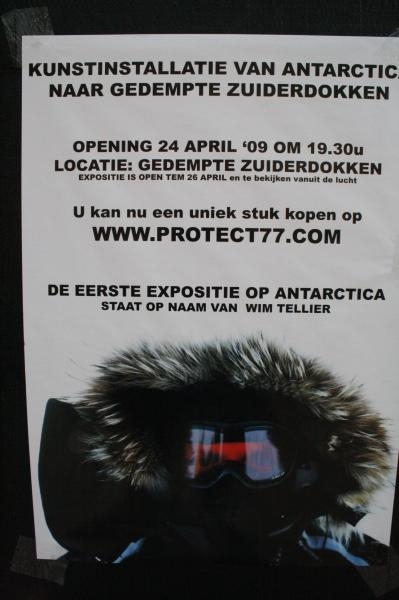 De Antwerpse kunstfotograaf Wim Tellier,bekend van de 600m2 grote babyfoto op de Grote Markt in 2006,slaagde er op 2 en 3 februari jl.in zijn 6 enorme foto's van 800m2 elk,in uitermate moeilijke omstandigheden op een bijna 30.000m2 grote sneeuw-en ijsvlakte voor de Princess Elisabeth poolbasis op de Zuidpool te installeren.Daarmee realiseerde hij in wereldpremière de eerste kunstexpositie ooit op Antarctica.Nu(vanaf vrijdag 19.30uur)is die kunstinstallatie gratis te zien op de Antwerpse Zuiderdokken,die daarmee volledig ingenomen worden.Dit is de eerste kans die het publiek krijgt,en voor Antwerpen meteen de laatste,om met dit uitzonderlijke project kennis te maken.Later gaat de installatie nog naar New York