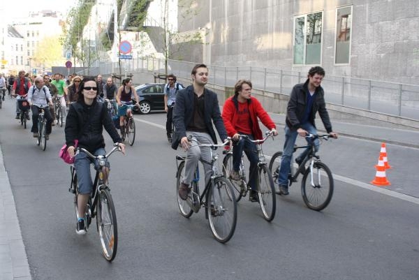 Critical Mass zijn dus fietsers die zich willen laten zien. Die hopen dat er met hen rekening wordt gehouden. Want ze zijn met vele tienduizenden in Antwerpen, de fietsers, elke dag. Ga maar'ns na: als er zoveel auto's opdagen, staat de stad stil.