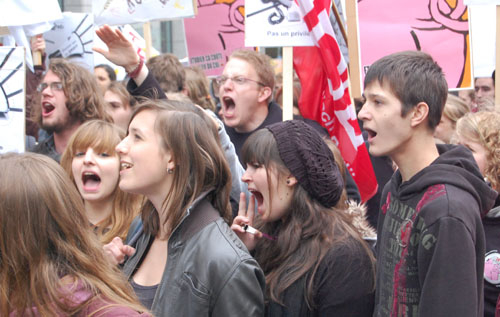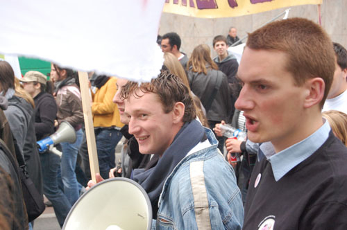Enkele uitspraken van de Vlaamse studenten: "Meer centen voor studenten!", "De Franky is nen blauwen, nen neoliberaal. Geen centen voor studenten, dat is asociaal!", "Vandenbroucke, wij willen meer boeken!"