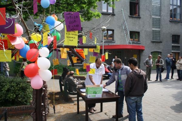 Want belofte maakt schuld... Woensdag 13 mei is de bezettingsactie halfweg en die gelegenheid zal niet ongezien voorbij gaan. Een prikactie is voorzien om 18uur in de Sint-Amanduskerk in de Van Kerkhovenstraat in Antwerpen-Noord.