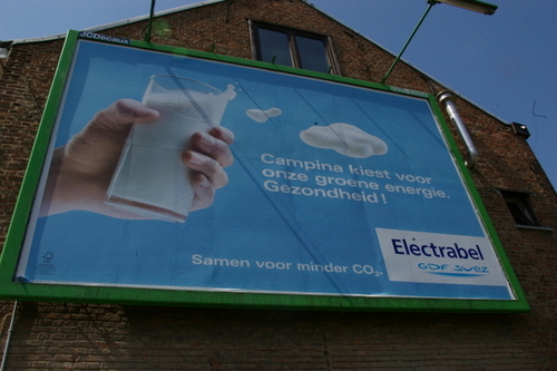 Overal in België duikt de nieuwe stunt van Electrabel op: grote reclamepanelen langs de baan en affiches in bus en tramhokjes, met de opschriften: “Reeds ******** gezinnen zijn Groen Plus” of “Campina kiest voor onze groene energie. Gezondheid!”