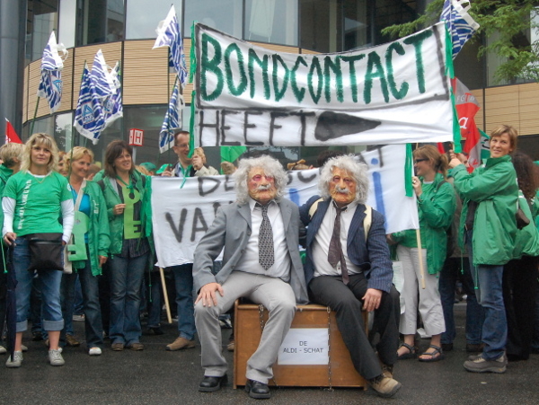 BRUSSEL – Vandaag voerden zo'n 600 werknemers uit de handelsector actie voor de gebouwen van de Federale Overheidsdienst voor Werkgelegenheid, Arbeid en Sociaal Overleg. Ze eisen dat de koopkrachtmaatregelen die in het interprofessioneel akkoord (IPA) voor 2009-2010 staan, ook effectief worden uitgevoerd. De vakbonden zeggen dat dit het overleg van de laatste kans is. Op dit moment zijn de onderhandelingen nog altijd aan de gang. Als er geen oplossing uit de bus komt, is de kans groot dat er zaterdag gestaakt wordt.