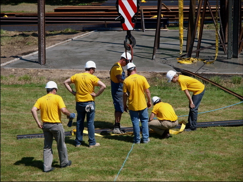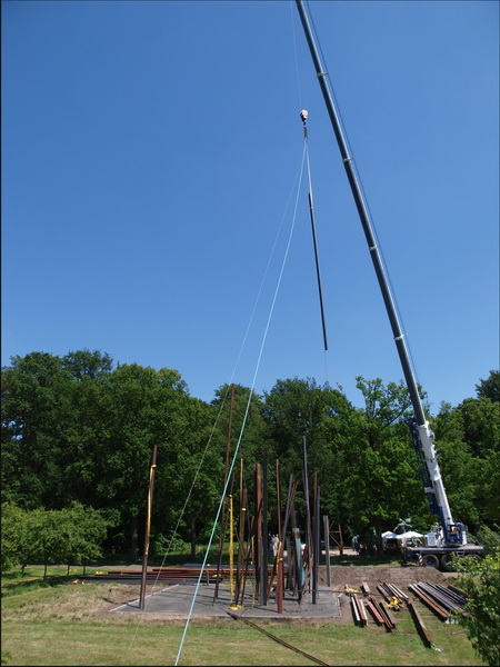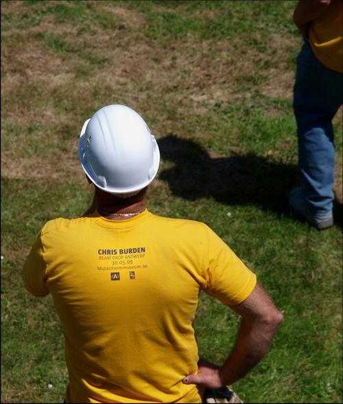 Of alles samen ? Lag het aan het prachtig zonnig weer of waren velen kunstliefhebbers komen kijken naar het ontstaan een conceptueel kunstwerk van Chris Burden ? Zestig metalen balken werden van 30 meter hoog in zachte beton naar beneden geknald. Kunst geboren uit chaos en toeval ? Feit is dat er veel volk was en dat ze genoten van een zonnige zaterdagnamiddag met een droogje en een natje. Dat ze getuigen waren van de geboorte van een kunstwerk zal de toekomst moeten uitmaken ! Enkele sfeerbeelden