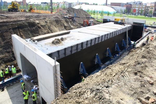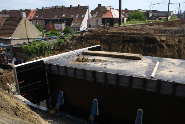 Om deze tunnel te kunnen plaatsen werd een opening gegraven onder de spoorweg.Zaterdagmiddag was de volledige opening onder de spoorweg vrijgemaakt.De tunnel werd de zondag namiddag onder de sporen geschoven.De tunnel is 25 meter lang,4 meter hoog en 5 meter breed.Hij werd volledig opgekrikt,op rails gezet en heel voorzichtig(licht berg af)in de opening geschoven.Deze operatie nam amper 2 uur in beslag.Nadien starten al de aanvulwerken.