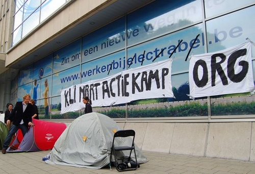 Vrijdagmiddag hebben enkele actievoerders hun tentje opgeslagen voor het Electrabel gebouw aan de Mechelsesteenweg in Antwerpen. De slogan op de voorgevel werd tijdelijk omgebogen ten voordele van het klimaatactiekamp dat ze volgende maand houden.