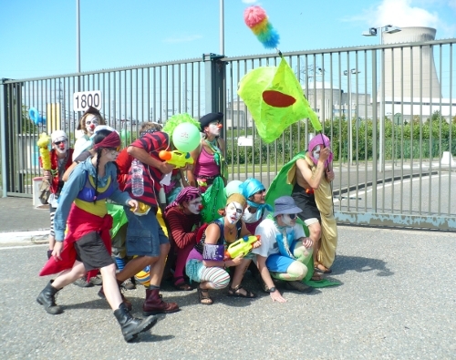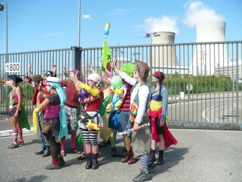 Met twee busjes vertrokken een twintigtal clowns richting Doel. Gehuld in kleurrijke clownpakjes, opblaasbare bootjes en zwembandjes. "We houden van de klimaatopwarming riepen ze in koor. Door de kerncentrale Doel kunnen we binnenkort piraatje spelen in een subtropisch zwemparadijs."