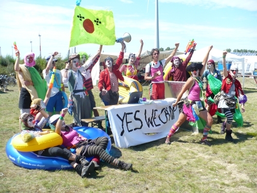 Zandvliet -- Ook de clownarmy is van de partij op het Klimaatactiekamp. Ze maken van de gelegenheid gebruik om via de clowntraining workshops nieuwe clowns te rekruteren onder de kampdeelnemers. "Het is aardig gelukt," zegt één van de clowns. "Gisteren deden we een actie met vijf clowns nu zijn we al met meer dan vijftien." Vandaag planden ze een actie aan de kerncentrale van Doel. Met hun ludieke actie "Operatie Piraat" willen ze protesteren tegen de vervuiling van kerncentrales. Clowns nemen hun acties altijd heel serieus. Lees hier alvast hun uitleg.