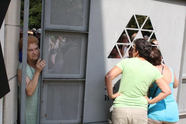 Honderden senioren staan voor gesloten poort Openluchttheater Rivierenhof ,voor gratis concert van de 'North Side Big Band'!