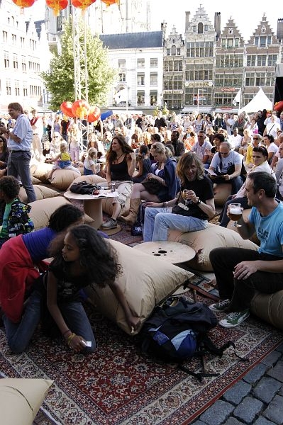 [Antwerpen] De Grote Markt lag er feestelijk en exotisch bij zaterdag. Fel rode lampions overspanden de ruimte voor het podium die geheel bedekt was met tapijten. Voor het zitcomfort lagen enorme kussens, niet van stof of plastic maar een soort papier. Het opzet van dit feest was het interculturalisme. De optredende groepen en presentators waren van een zeer diverse afkomst.