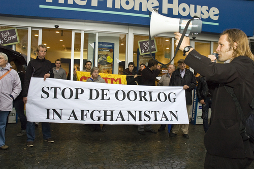 BRUSSEL -- Op 7 oktober zal het acht jaar geleden zijn dat de VS-troepen de Afghanistan-oorlog begonnen. "Wij willen deze oorlog "bevriezen", we staan stil bij het lot van de vele burgerslachtoffers, we eisen een ommekeer in het Belgisch beleid", zeggen vredesactivisten die vanavond actie voerden op het Muntplein en in de Nieuwstraat in Brussel. De actie was een initiatief van het Anti-Oorlogsplatform.