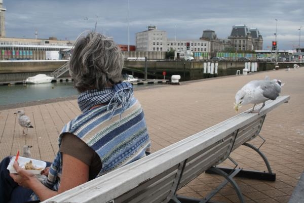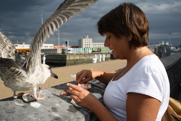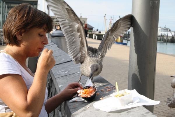 In Oostende dus-2 bovenste- foto's kunt je nog rustig eten,en de meeuwen vragen 'op afstand' wat 'aandacht'(eerste foto),of zelfs word er een handje bijgestoken brengt het nog weinig resultaat op(tweede foto).