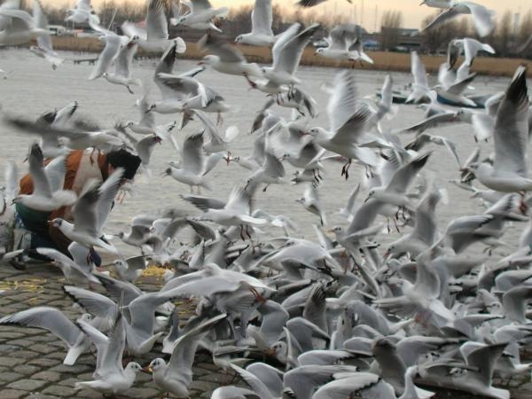 ...maar is doodgewoon ,nu ook al Antwerpse bekend gezicht,die 365 per jaar(storm,geen storm,sneeuw of ijzel), de "Antwerpse" meeuwen komt voeden in de laat namiddag aan de Scheldekaaien:niets anders dan een dierenliefhebber(in hart en ziel...).