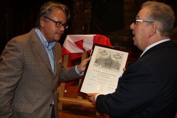 Antwerpse schepen voor Cultuur,Philip Heylen mocht ook als erevoorzitter van harmonie Antverpia deze op het Stadhuis zaterdag in de bloemen zetten.(en gids-met plezier- spelen)