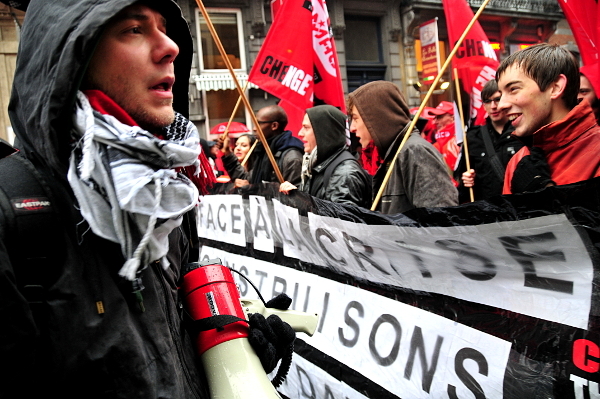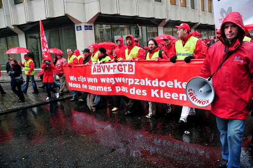 Gewapend met paraplu's en dikke regenjassen kwamen enkele duizenden militanten van het ABVV en ACLVB naar Brussel. De betoging begon aan het Madouplein waar een vakbondsdelegatie een onderhoud had met minister van Werk Joëlle Milquet (CDH) en minister van Sociale Zaken Laurette Onkelinx (PS).