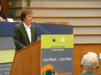 Paul McCartney wees het Europees Parlement op haar taak om mensen aan te moedigen hun vleesconsumptie te verminderen. “Vlees eten is niet langer een individuele keuze, want het heeft invloed op de ganse planeet.” In het Verenigd Koninkrijk startte hij de campagne Meat Free Monday, een beetje zoals Donderdag Veggiedag in Gent. “Mensen zullen niet snel geneigd zijn om vegetariër te worden, maar één vleesloze dag per week is een haalbare eerste stap voor iedereen.”
