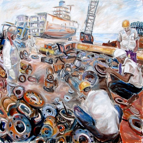 While reading the International Herald Tribune I came across an article entitled 'Deal near for global pact on ship recycling' (15 May 2009). The article notes that '[t]he dismantling of ships, so that their steel and other materials can be sold as scrap, is often done on or near beaches in poor countries, notably India and Bangladesh. Both nations have pledged to improve working conditions and environmental practices. But labor advocates contend that the process still kills and maims many workers each year and results in the contamination of shorelines with asbestos, oily waste, toxic paint and other dangerous materials.' It struck me that it is rare to see images of people in such working conditions depicted in paintings.