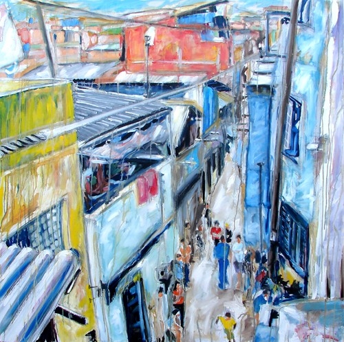 Following Sartre's dictum that 'to reveal is to change' I decided to make a painting that would in a sense 'reveal' this type of work to those like myself who had never come across it before. Like many bad situations they continue without change for a long time because of a lack of awareness of their existence by many who often benefit directly or indirectly from them. I looked at other situations where people worked in very bad and sometimes even horrific working conditions (such as recycling in dumps where children have been buried in the process). I talked about this to friends who told me of other situations (such as sulphur workers in Indonesia who carry 70 - 100Kg's on their backs for 2-3hrs to make $1 causing at the same time burnt skin and lungs).