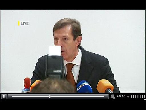 De cameraman van de VRT probeerde het leed te beperken door in te zoomen op de woordvoerder, maar natuurlijk mocht de microfoon met het logo van de VRT nieuwsdienst niet uit het beeld verdwijnen.