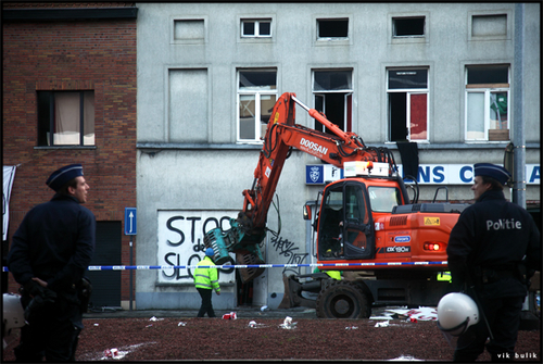 GENT - Deze ochtend omstreeks 5 uur wierpen activisten van de kraakpanden gelegen aan de Hundelgemsesteenweg te Ledeberg hun barricade op. Zo'n zestig politieagenten en nog es evenveel werkers én brandweermannen konden de bewoners in enkele uren uit hun huisjes verdrijven. Waarna men meteen begon met het onleefbaar maken van de panden. Alle ramen en deuren werden stuk geslagen, dakpannen van het dak gehaald,... Wanneer de werkelijke afbraak beginnen zal is nog maar de vraag.