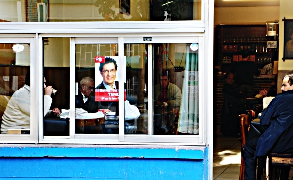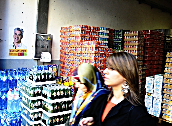 De verkiezingen beginnen stilletjes aan het straatbeeld te domineren. Je vraagt je wel of de bezoekers van de markt en de omliggende winkeltjes door ook maar één van die posters hun stemgedrag laten bepalen. Opvallend is alvast dat de winkeliers het hele spectrum laten hangen, ook al hebben ze hun eigen voorkeur.