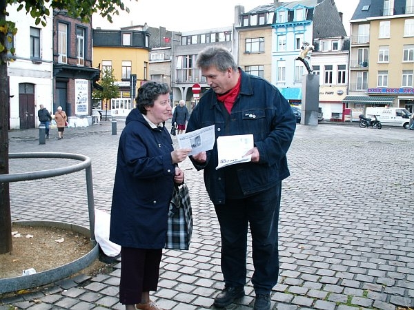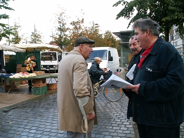 Aangekomen op de markt van het Sint Jansplein word ik bijna omver geflyerd door de gele brigade van het Vlaams Belang. Even de markt oversteken waar de militanten van het ABVV hun pamfletten uitdelen en met marktbezoekers stonden te praten.