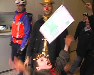 Bij iedere bank werd er even halt gehouden en werd een opsomming gegeven van hun investeringen in mensenrechtenschendingen. KBC en ING kregen tot groot jolijt van de deelnemers een extra verrassing te verwerken toen ze plots de gehele stoet in hun kantoor mochten ontvangen. De optocht werd van muziek voorzien door de wandelende muzikanten van Orchestre International de Vetex, een gespecialiseerd regiment van het clown leger nam het aanbidden van het standbeeld en het goudzoeken voor zijn rekening, ROR Tactical Frivolity was taktisch frivool en Cirque del Mundo jongleerde, dit alles met inhoudelijke steun van het nieuwpoort theater. Als hoogtepunt van de actie werd het gouden kalf op zijn metershoge poten gezet, vlak voor het kantoor van KBC. Het kalf zal daar tijdens het verdere verloop van de campagne blijven staan, bedoeld als artistieke doorn in het oog van de banken.