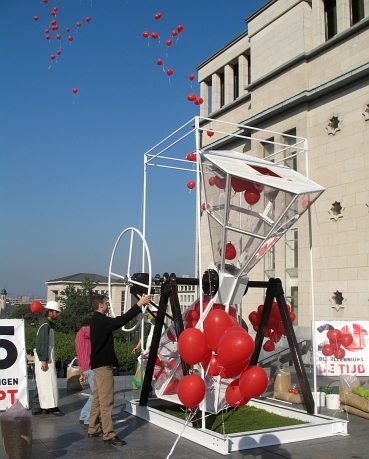 BRUSSEL -- Met een reuzezandloper vol ballonnen schoot de Noord-Zuidbeweging samen met tal van andere organisaties de campagne voor een wereldwijde duurzame landbouw op gang. Tegen 2015 de honger en de armoede in de wereld halveren, zo luidt de eerste Millenniumdoelstelling. “Tijd dat we de wereldleiders herinneren aan die belofte”, zegt Bogdan Vanden Berghe van 11.11.11.