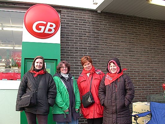 Josfien (niet op foto) werkt al 30 jaar parttime in de GB aan de Groenplaats. " Hier in de GB worden alleen nog parttimers aangenomen. Als ik op prepensioen wil gaan dan moet ik al meer dan 60 jaar werken. En ik zie mij over 30 jaar niet met een stokske naar de kassa strompelen.".