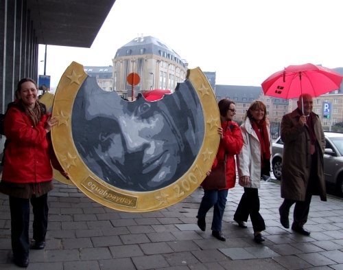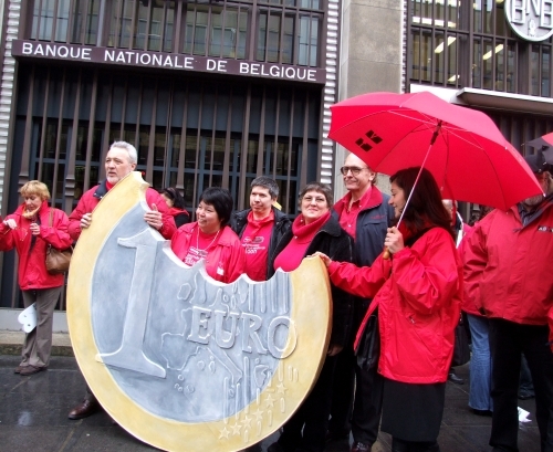 In Brussel voerden de ABVV-vrouwen en zij-kant eerst actie aan Brussel Centraal waar ze deurklinkhangers en chocolademuntjes uitdeelden aan de pendelaars. Nadien gingen ze naar de Nationale Bank van België om ook daar deurklinkhangers uit te delen aan het personeel. Want ook in de banksector worden vrouwen nog steeds minder betaald dan mannen.