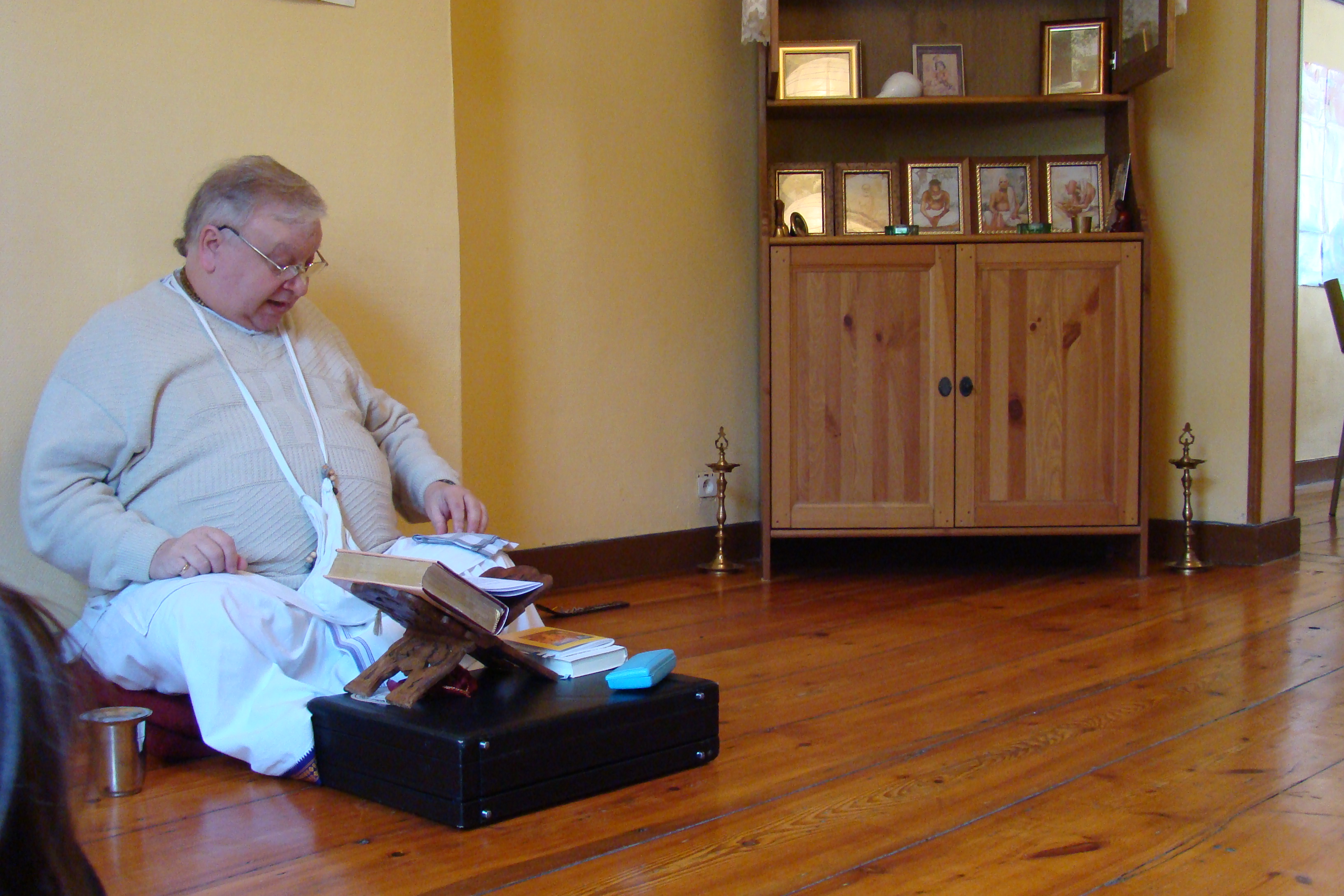 ‘Hare Krishna” groet hij tegen ons en het antwoord galmt volmondig terug. De wat dik uitgevallen man neemt steunend zijn plek in op het matje tegenover ons en dan kan de dienst beginnen.